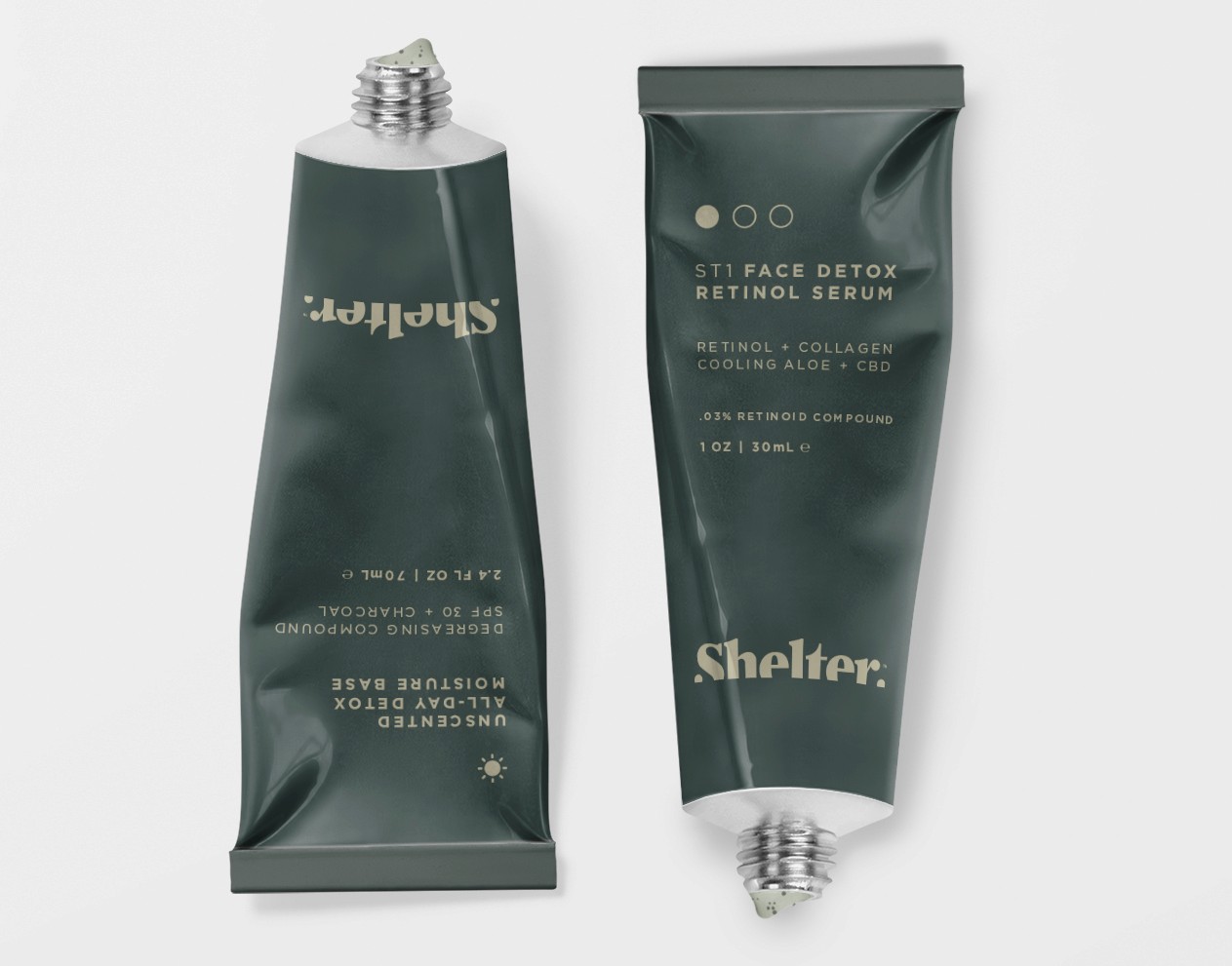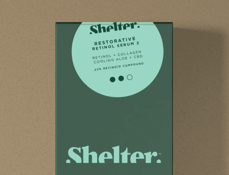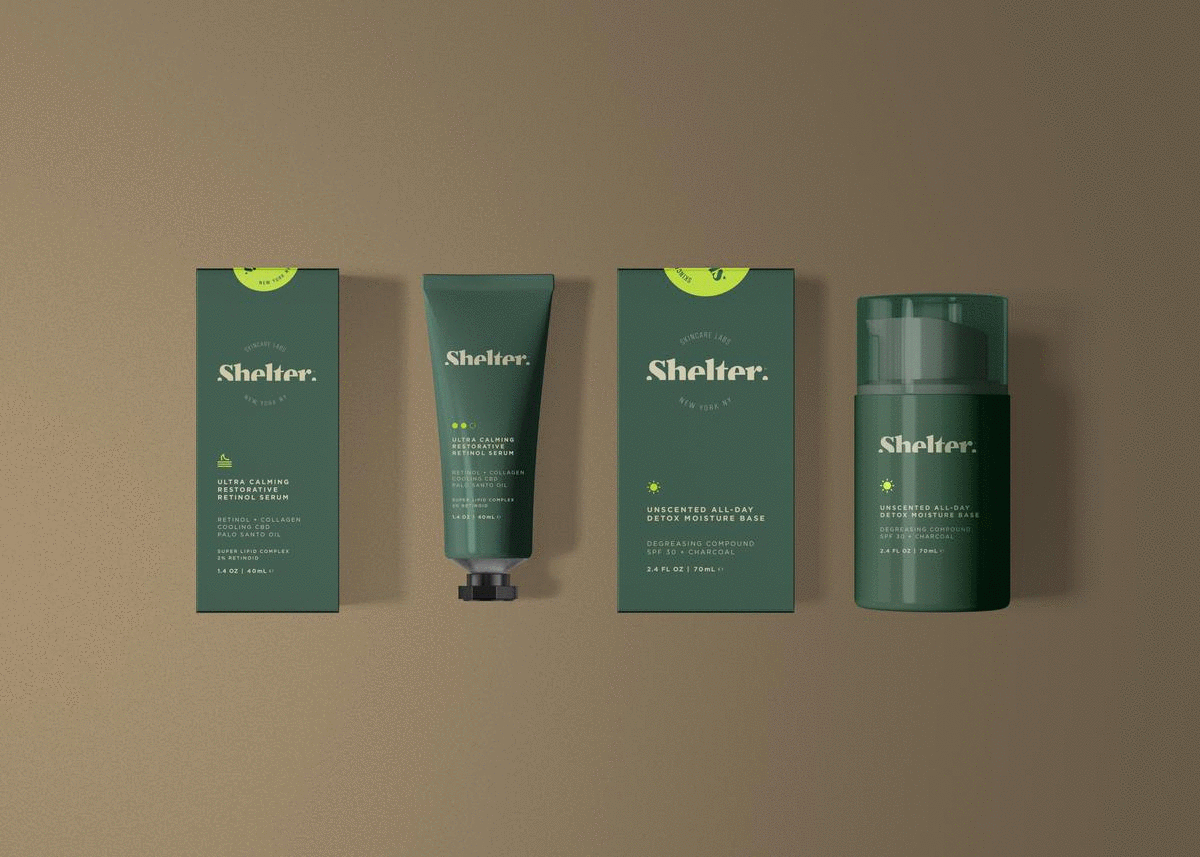 Cultivated in confidence, Shelter products bring preparation and premium the whole way. With natural ingredients like charchoal, eucalyptus, and palo santo, paired with collagen, retinol, SPF, and CBD, Shelter products are comfortable enough for everyday use in urban and lesser developed environments. The brand itself exudes depth, with the half-absorbed word mark and gooey icon set (nodding to product use), along with rich green and brown tones met with neon. Shelter packaging takes reference from outdoor gear, and even has a glowing lumen like a watch.