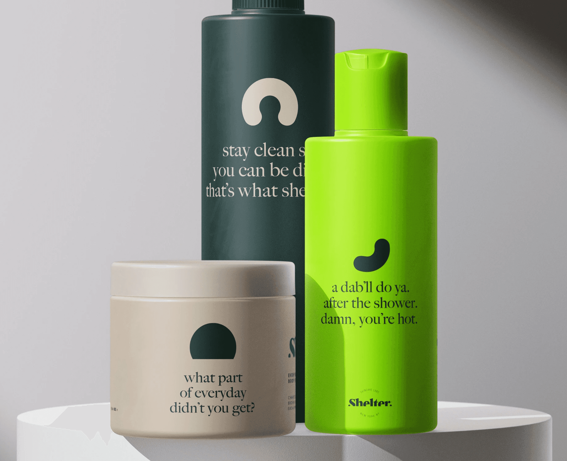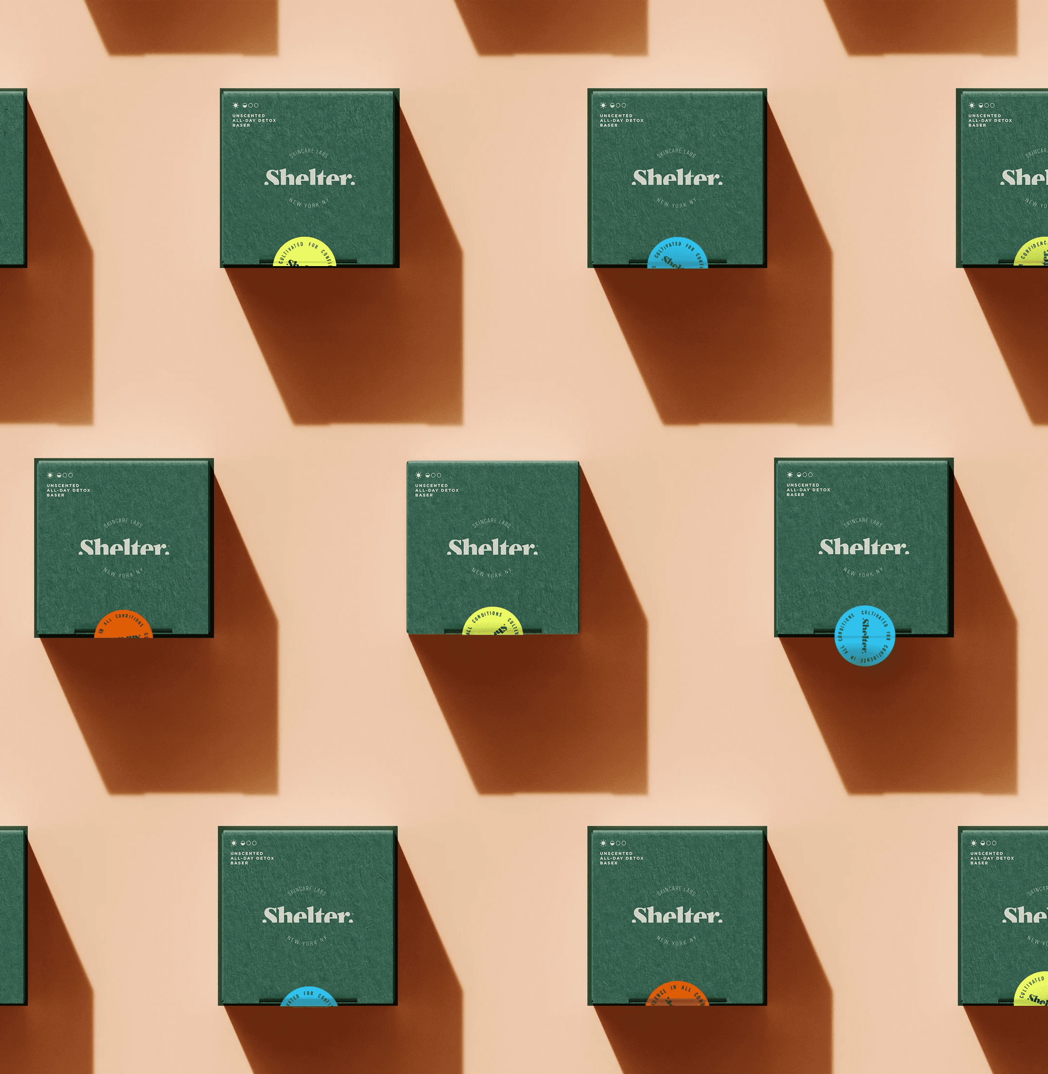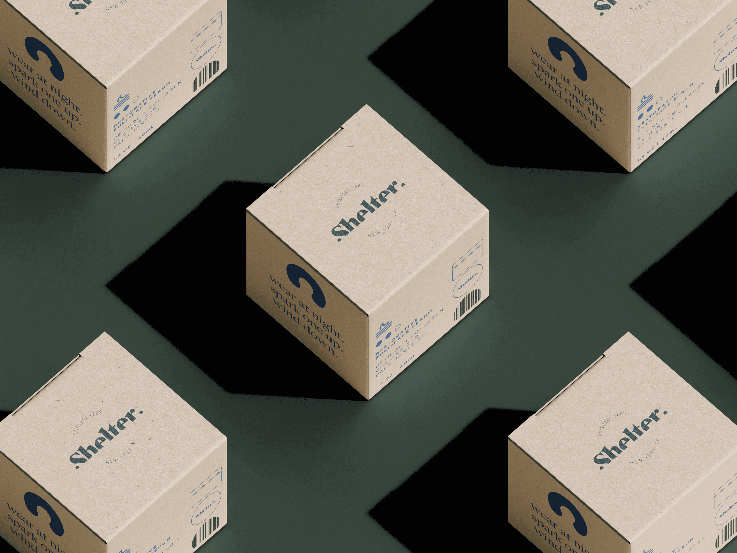 Cultivated in confidence, Shelter products bring preparation and premium the whole way. With natural ingredients like charchoal, eucalyptus, and palo santo, paired with collagen, retinol, SPF, and CBD, Shelter products are comfortable enough for everyday use in urban and lesser developed environments. The brand itself exudes depth, with the half-absorbed word mark and gooey icon set (nodding to product use), along with rich green and brown tones met with neon. Shelter packaging takes reference from outdoor gear, and even has a glowing lumen like a watch.